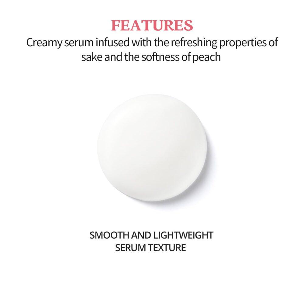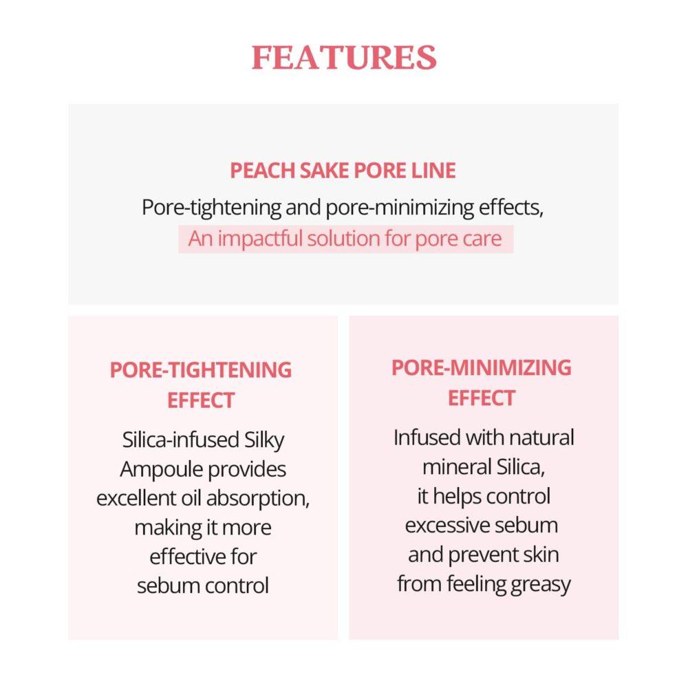 - Minimizes Pores: Combines rice ferment filtrate (sake) and peach extract to visibly reduce the appearance of enlarged pores for a smoother texture.