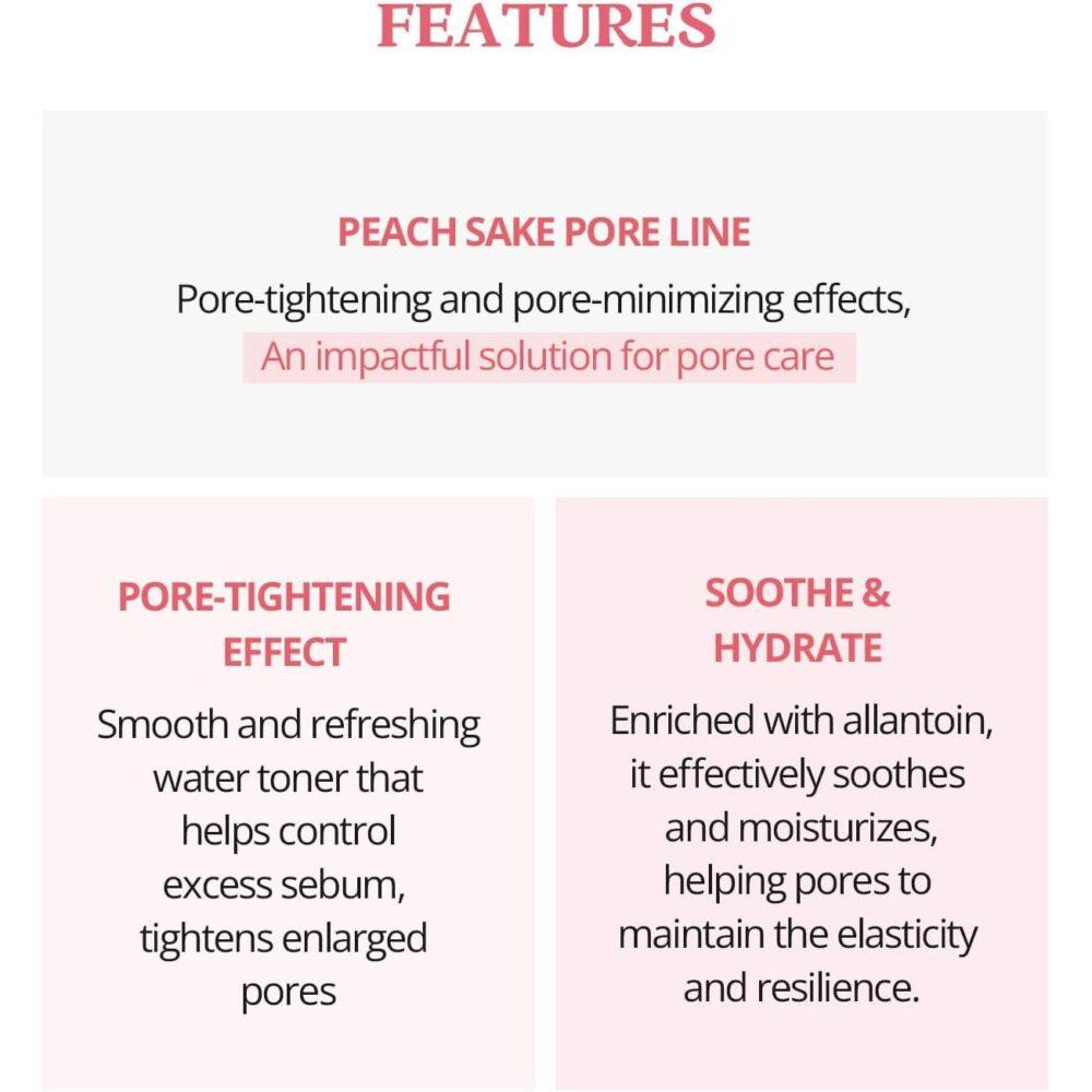 - Minimizes Pores: Enriched with rice ferment filtrate (sake) and peach extract, this toner visibly reduces the appearance of enlarged pores for a refined skin texture.