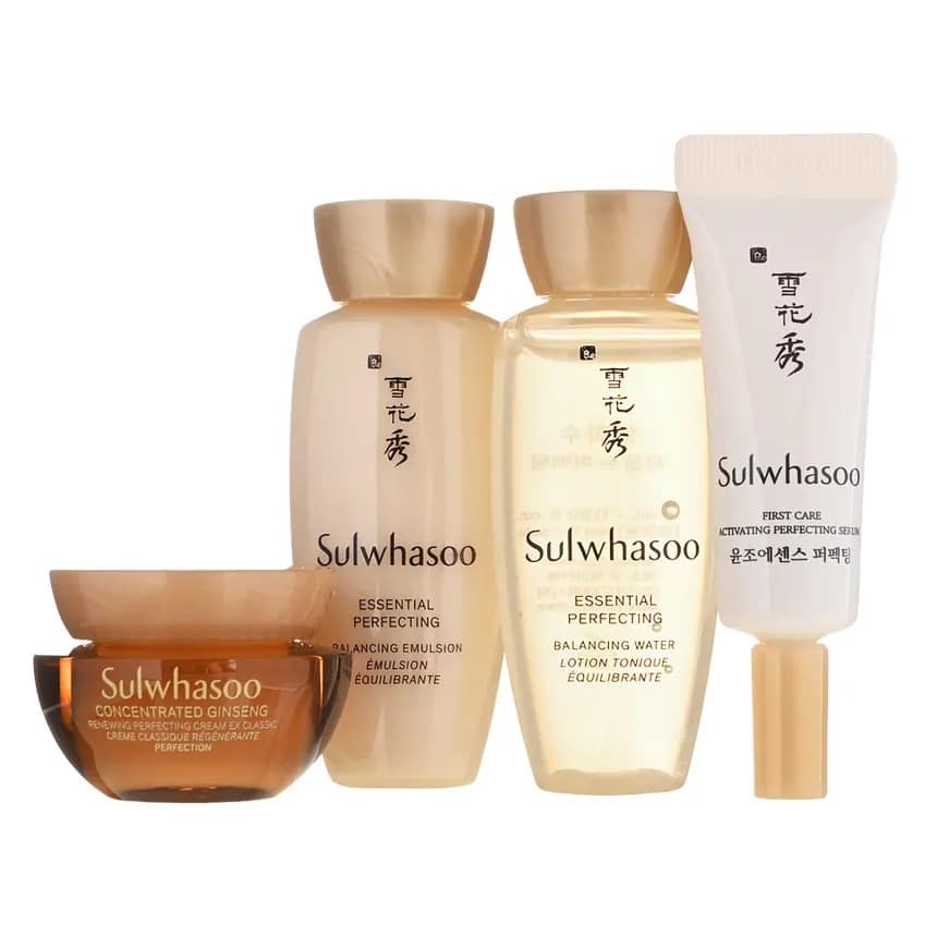 Buy Sulwhasoo Perfecting Daily Routine Kit for a glowing, hydrated complexion. This luxurious 4-step skincare set includes the First Care Activating Serum, Essential Balancing Water, Essential Balancing Emulsion, and Perfecting Cushion to hydrate, balance, and protect your skin. Infused with Ginseng, Licorice, and Green Tea, it’s ideal for all skin types, including sensitive skin. Add to cart now for radiant, healthy skin!