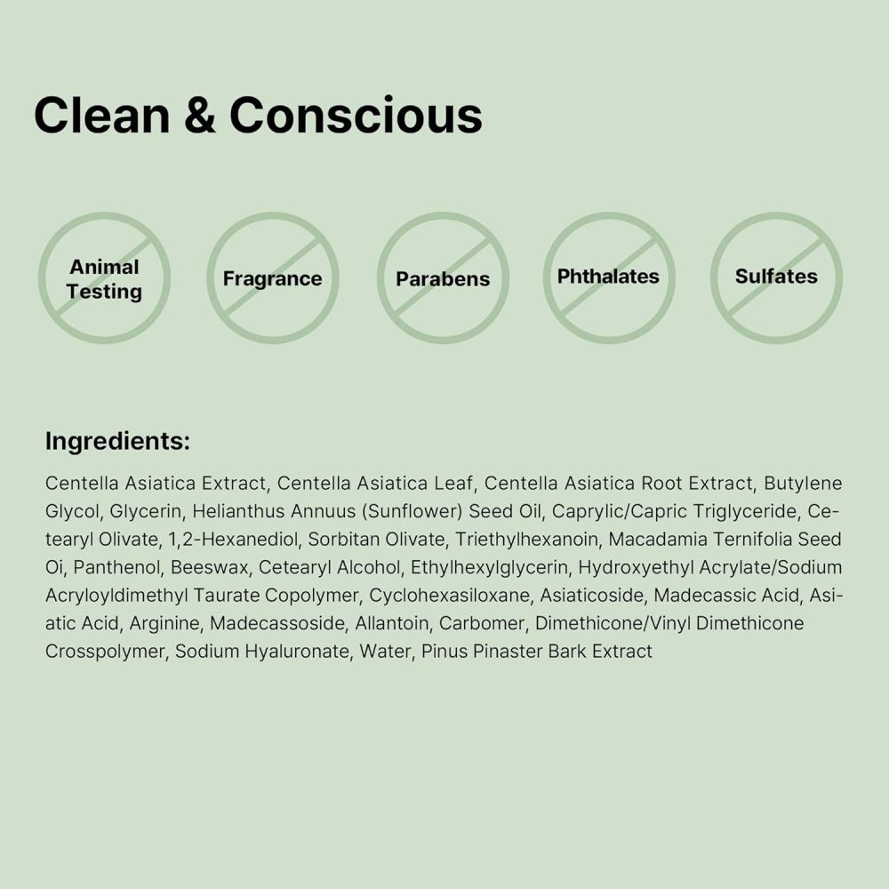 Centella Asiatica Extract, Centella Asiatica Leaf Extract, Centella Asiatica Root Extract, Butylene Glycol, Glycerin, Caprylic/Capric Triglyceride, Helianthus Annuus Seed Oil, Cetearyl Olivate, 1,2-Hexanediol, Sorbitan Olivate, Macadamia Ternifolia Seed Oil, Triethylhexanoin, Allantoin, Aqua, Arginine, Asiatic Acid, Asiaticoside, Carbomer, Cera Alba, Cetearyl Alcohol, Cyclohexasiloxane, Dimethicone/Vinyl Dimethicone Crosspolymer, Ethylhexylglycerin, Hydroxyethyl Acrylate/Sodium Acryloyldimethyl Taurate Copolymer, Madecassic Acid, Madecassoside, Panthenol, Pinus Pinaster Bark Extract, Polysorbate 60, Sodium Hyaluronate, Sorbitan Isostearate, Tocopherol