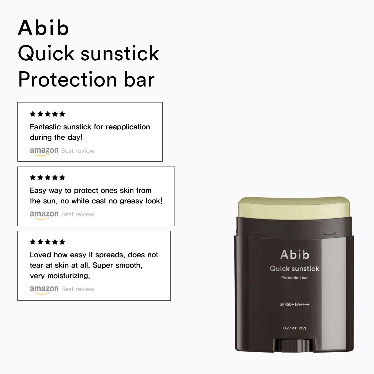 Buy Abib Quick Sunstick Protection Bar SPF50+ PA++++ for powerful, broad-spectrum sun defense. This portable, non-greasy sunstick delivers a smooth, lightweight finish without a white cast, perfect for reapplication on the go. Enriched with Centella Asiatica, Hyaluronic Acid, and Green Tea Extract for a hydrating, soothing experience, ideal for all skin types.