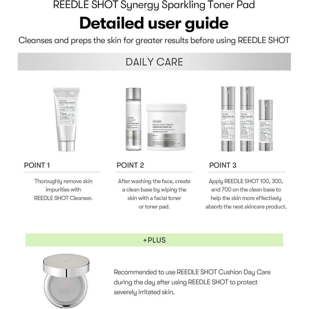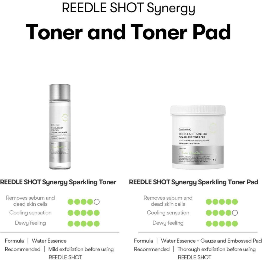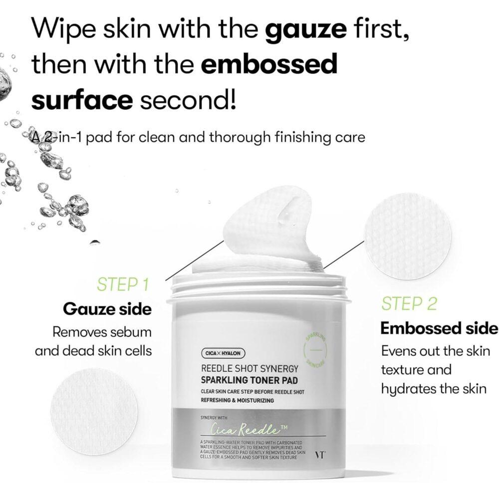 - VT Cosmetics – Reedle Shot Synergy Sparkling Toner Pad is suitable for all skin types, especially those with dullness, uneven skin tone, or large pores.