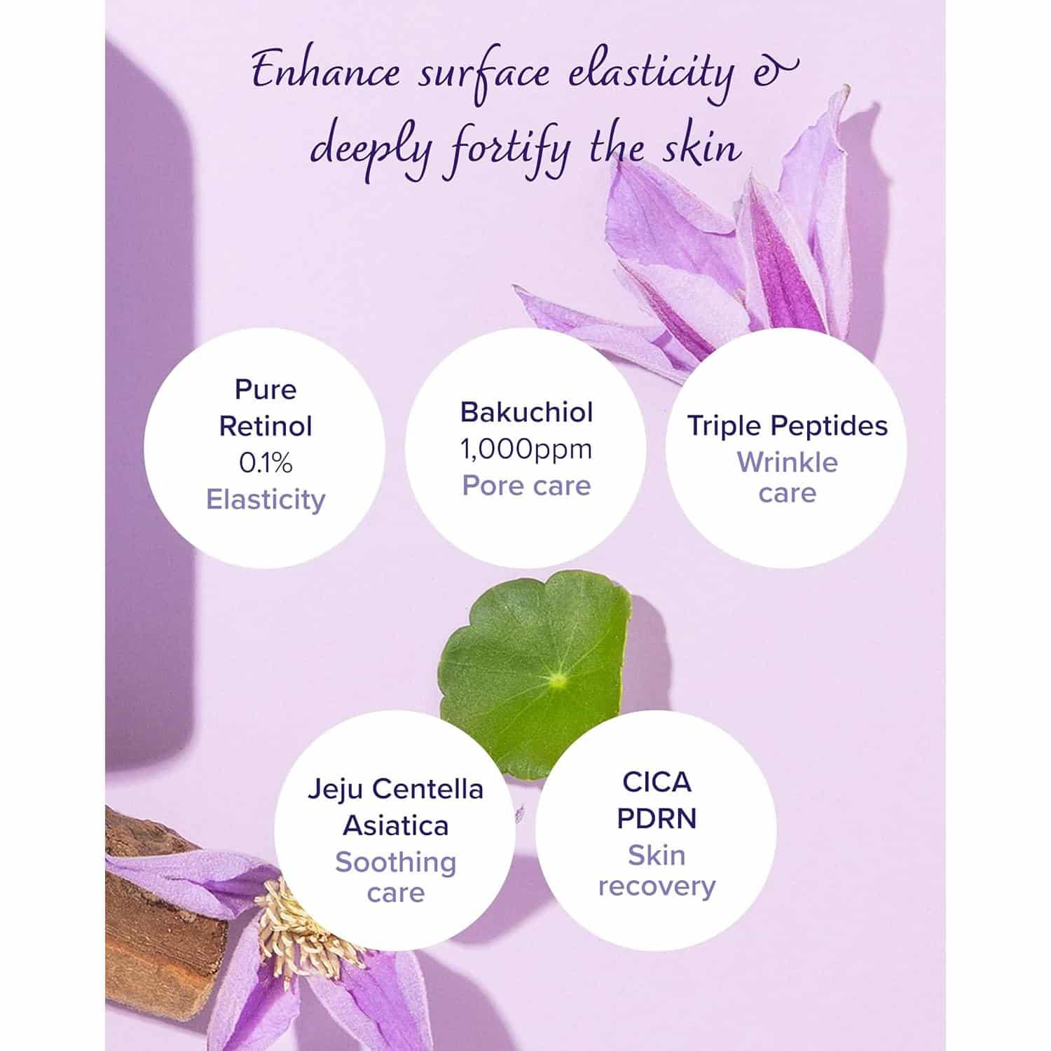 Retinol boosts collagen, bakuchiol enhances firmness, and Centella Asiatica soothes for smoother skin.