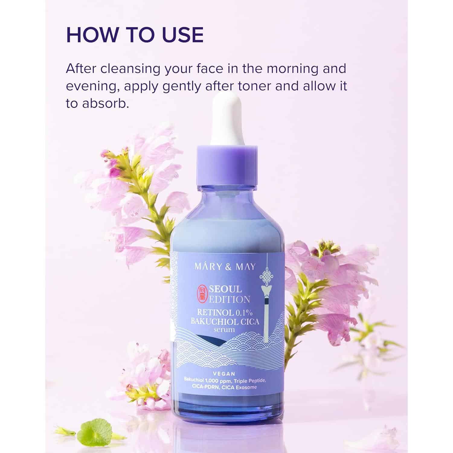 - After cleansing and toning, apply 2–3 drops of Mary & May Retinol 0.1% Bakuchiol Cica Serum.