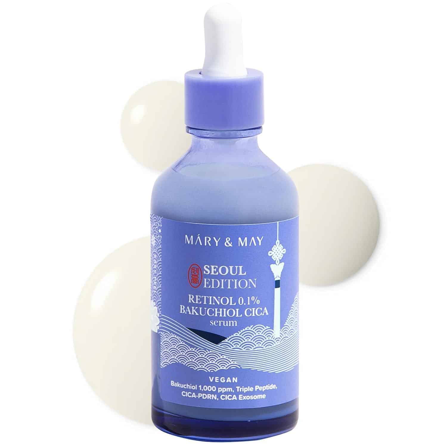 Buy Mary & May Retinol 0.1% Bakuchiol Cica Serum Seoul Edition for youthful skin. This vegan retinol serum with bakuchiol and Centella Asiatica smooths wrinkles and refines pores, perfect for sensitive skin. Add to cart for K-beauty radiance!
