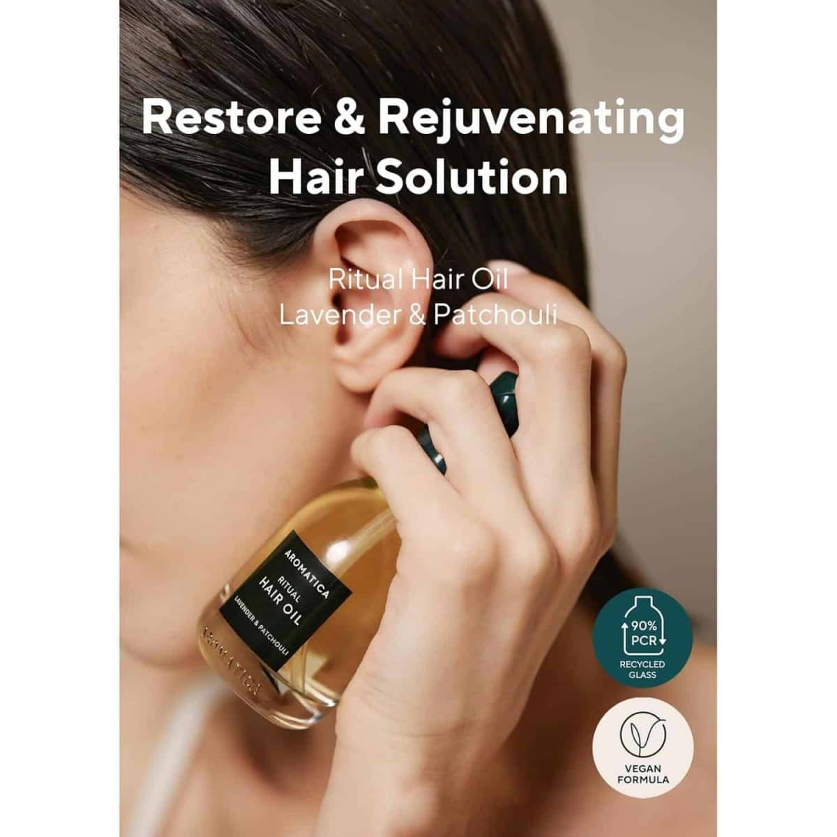 Nourish your hair with Aromatica Ritual Hair Oil Lavender & Patchouli for a radiant shine.