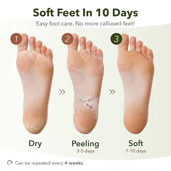 Buy Purederm Shiny & Soft Foot Peeling Mask to exfoliate and soften dry, rough feet with botanical extracts like lemon, tea tree, and honey. This at-home foot care treatment removes dead skin cells, softens calluses, and deeply hydrates your feet for silky-smooth results. Fits both men and women, any foot size. Simply wear, relax, and enjoy baby-soft feet in days!
