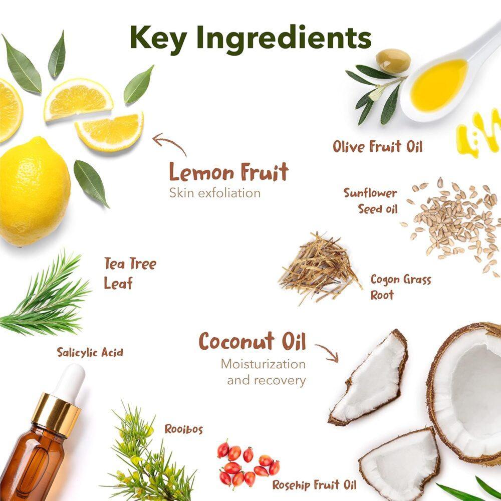 Alcohol Denat., Water, Lactic Acid, Urea, Isopropyl Alcohol, Glycolic Acid, Propylene Glycol, Betaine, Citrus Limon (Lemon) Fruit Extract, Acer Saccharum (Sugar Maple) Extract, Vaccinium Myrtillus (Bilberry) Fruit/Leaf Extract, Saccharum Officinarum (Sugar Cane) Extract, Citrus Aurantium Dulcis (Orange) Fruit Extract, Melaleuca Alternifolia (Tea Tree) Leaf Extract, Aspalathus Linearis (Rooibos) Extract, Imperata Cylindrica Root Extract, Honey Extract, Rosa Canina (Dog Rose) Fruit Oil, Cocos Nucifera (Coconut) Oil, Helianthus Annuus (Sunflower) Seed Oil, Olea Europaea (Olive) Fruit Oil, Hydroxyethylcellulose, Sodium Citrate, Salicylic Acid, PEG-60 Hydrogenated Castor Oil, Menthol, Allantoin, Tocopheryl Acetate, Disodium EDTA, Fragrance
