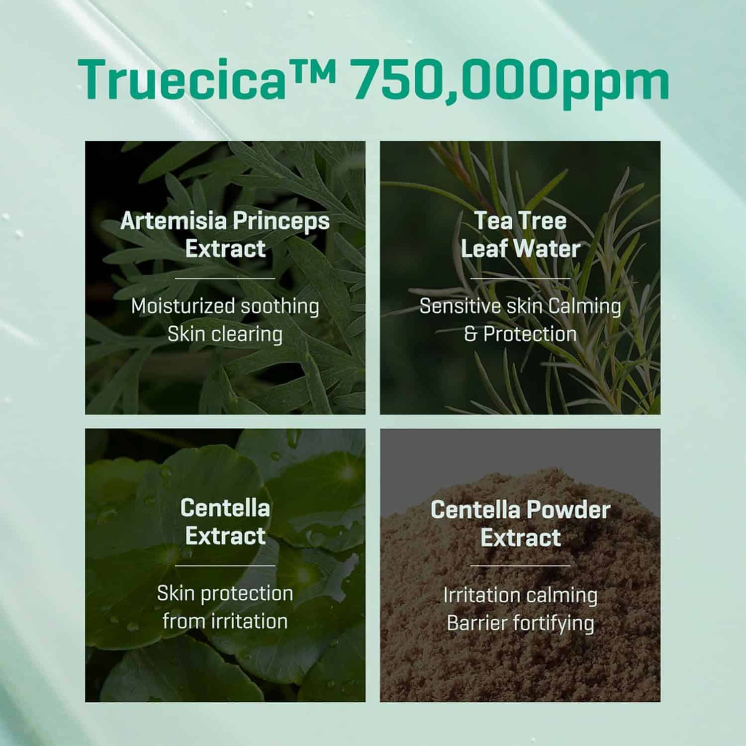 - Truecica™ (750,000 ppm): Combines Centella Asiatica and Tea Tree to soothe inflammation and strengthen the skin barrier.