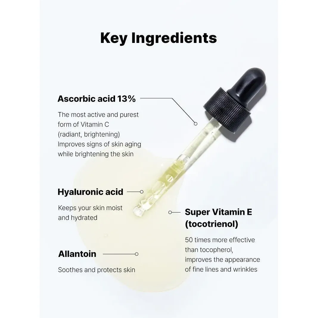 Water, Ascorbic Acid(13%), Butylene Glycol, Dipropylene Glycol, Tromethamine, 3-0-Ethyl Ascorbic Acid, Panthenol, Acetyl Glucosamine, Caffeine, Sodium Hyaluronate, Sodium Sulfite, Disodium EDTA, Glutathione, Adenosine, Gardenia Florida Fruit Extract, Allantoin, Dextrin, Squalane, Tocotrienols, Tocopherol, Elaeis Guineensis (Palm) Oil, Arginine, Niacinamide, Pentylene Glycol, Glycyrrhiza Glabra (Licorice) Root Extract