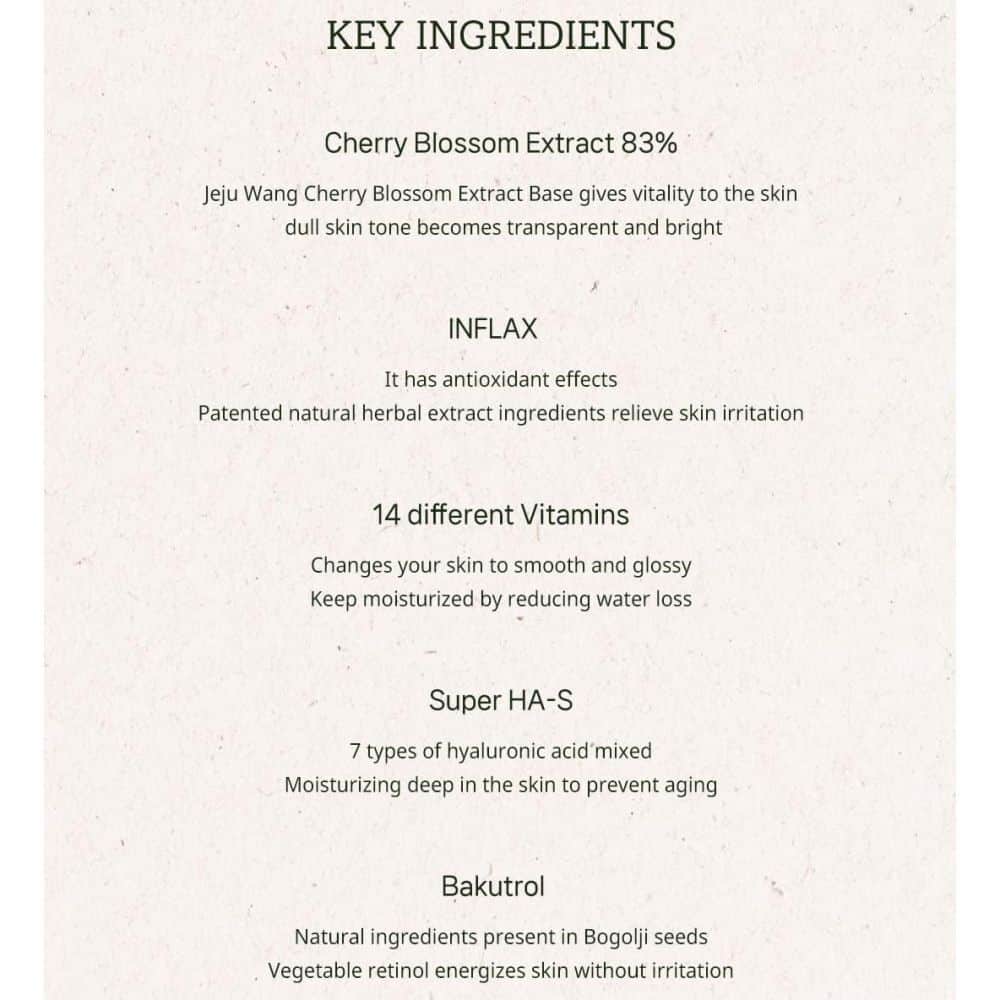 Prunus Yedoensis Flower Extract (83%), Butylene Glycol, 1, 2-Hexanediol, Niacinamide, Purified Water, PPG-26-Buteth-26, Glycerin, PEG-40 Hydrogenated Castor Oil, Glycereth-26, Sodium Hyaluronate, Sodium Polyacrylate, Acrylates/C10-30 Alkyl Acrylate Crosspolymer, Tromethamine, Eclipta Prostrata Extract, Bakuchiol, Allantoin, Sodium Polyacryloyldimethyl Taurate, Panthenol, Hydrogenated Polydecene, Adenosine, Citrus Aurantium Bergamia (Bergamot) Fruit Oil, Lavandula Hybrida Oil, Melia Azadirachta Leaf Extract, Helianthus Annuus Seed Oil, Disodium EDTA, Trideceth-10, Moringa Oleifera Seed Oil, Eucalyptus Globulus Leaf Oil, Ascorbic Acid, Opuntia Coccinellifera Fruit Extract, Morus Alba Bark Extract, Glycyrrhiza Glabra (Licorice) Root Extract, Diospyros Kaki Leaf Extract, Tocopheryl Acetate, Magnesium Ascorbyl Phosphate, Beta-Glucan, Ocimum Basilcum, Hydrolyzed Sodium Hyaluronate, Hydrolyzed Hyaluronic Acid, Hyaluronic Acid, Retinyl Palmitate, Sodium Hyaluronate Crosspolymer, Hydroxypropyltrimonium Hyaluronate, Sodium Acetylated Hyaluronate, Thiamine HCl, Riboflavin, Pyridoxine, Pantothenic Acid, Menadione, Folic Acid, Cyanocobalamin, Biotin, Limonene