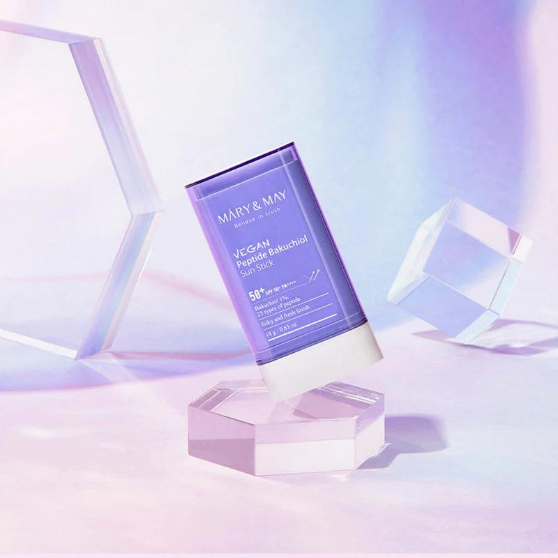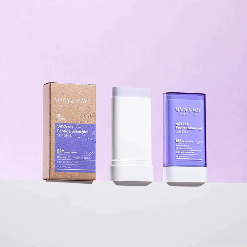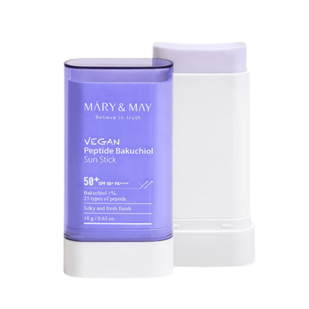 Buy Mary & May Vegan Peptide Bakuchiol Sun Stick SPF50+ PA++++ for optimal sun defense and anti-aging benefits. Featuring Bakuchiol and 25 Peptides for firming and rejuvenation, plus Tocopherol for antioxidant support. Lightweight, with a matte finish, it’s perfect for quick, portable protection.