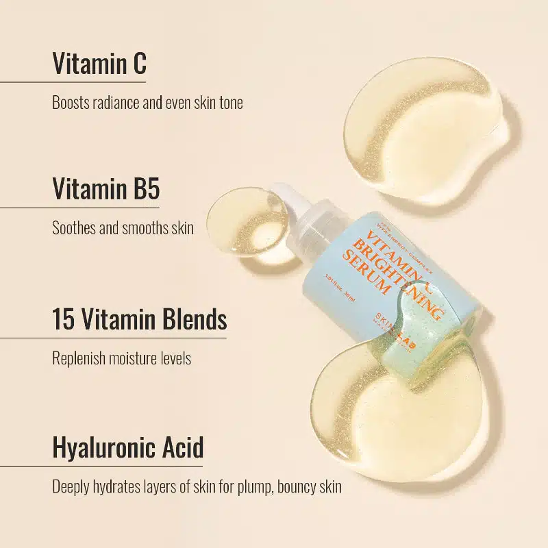 Buy SKIN&LAB Vitamin C Brightening Serum for radiant, even-toned skin. This lightweight serum combines synthetic Vitamin C and a 15% Vita Energy Complex to brighten, hydrate, and reduce dark spots. With added Vitamin E capsules and Hyaluronic Acid, it provides anti-aging benefits while locking in moisture. Suitable for all skin types.